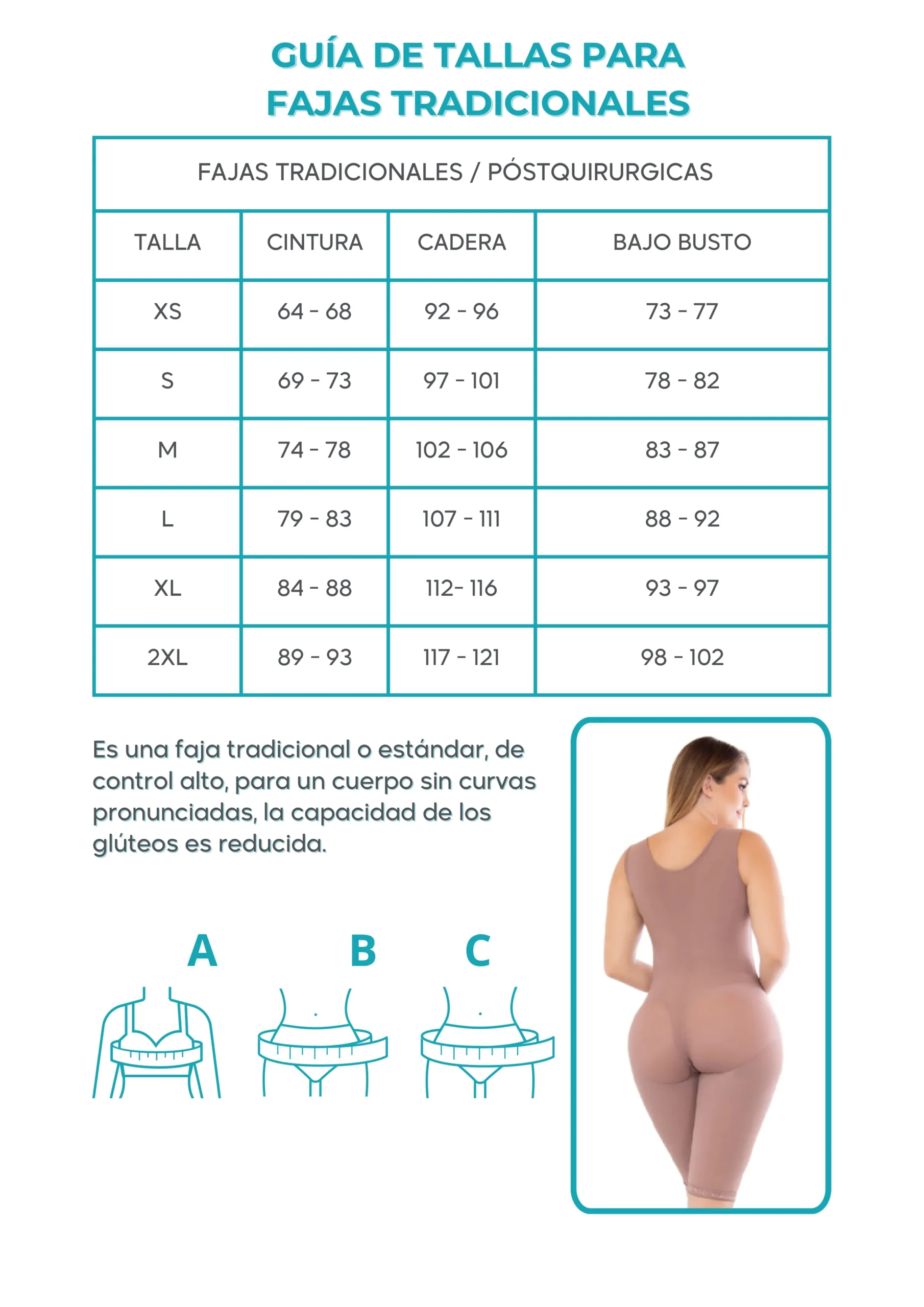 Faja postquirúrgica con diseño de manga sisa y busto libre para mayor comodidad y compatibilidad con cualquier brasier. Brinda soporte y control postoperatorio.